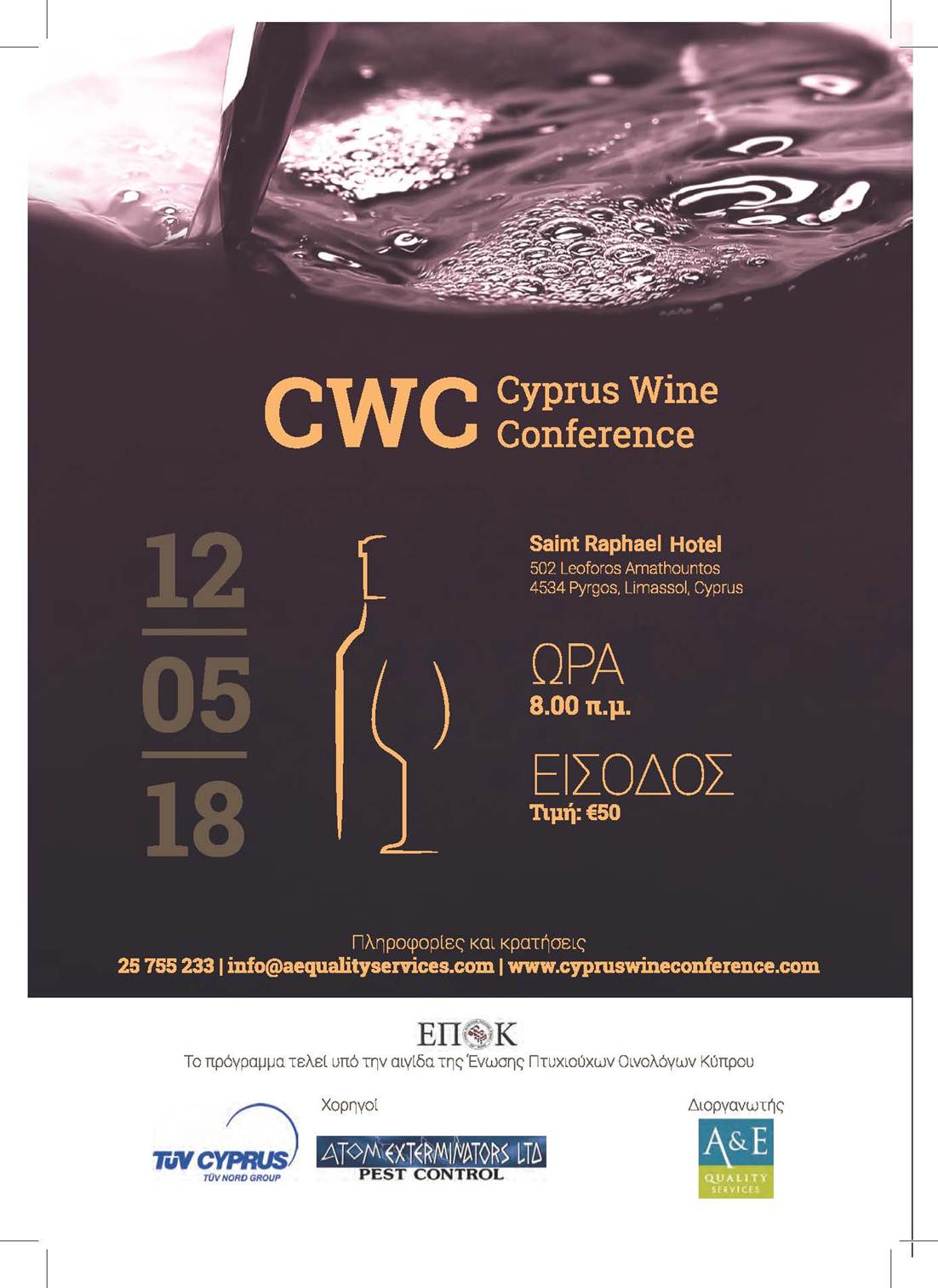 Αγαπητοί συνάδελφοι, Η Ένωση Πτυχιούχων Οινολόγων Κύπρου έχει θέσει υπό την αιγίδα της το επιστημονικό Συνέδριο Οίνου που διοργανώνει η εταιρεία A&C Quality Services, με κύριο ομιλητή τον έγκριτο επιστήμονα και καθηγητή οινολογίας στο Γεωπονικό Πανεπιστήμιο Αθηνών κύριο Γεώργιο Κοτσερίδη. Το συνέδριο θα πραγματοποιηθεί το Σάββατο 12 Μαΐου 2018 στο ξενοδοχείο Saint Raphael Resort στη [...]