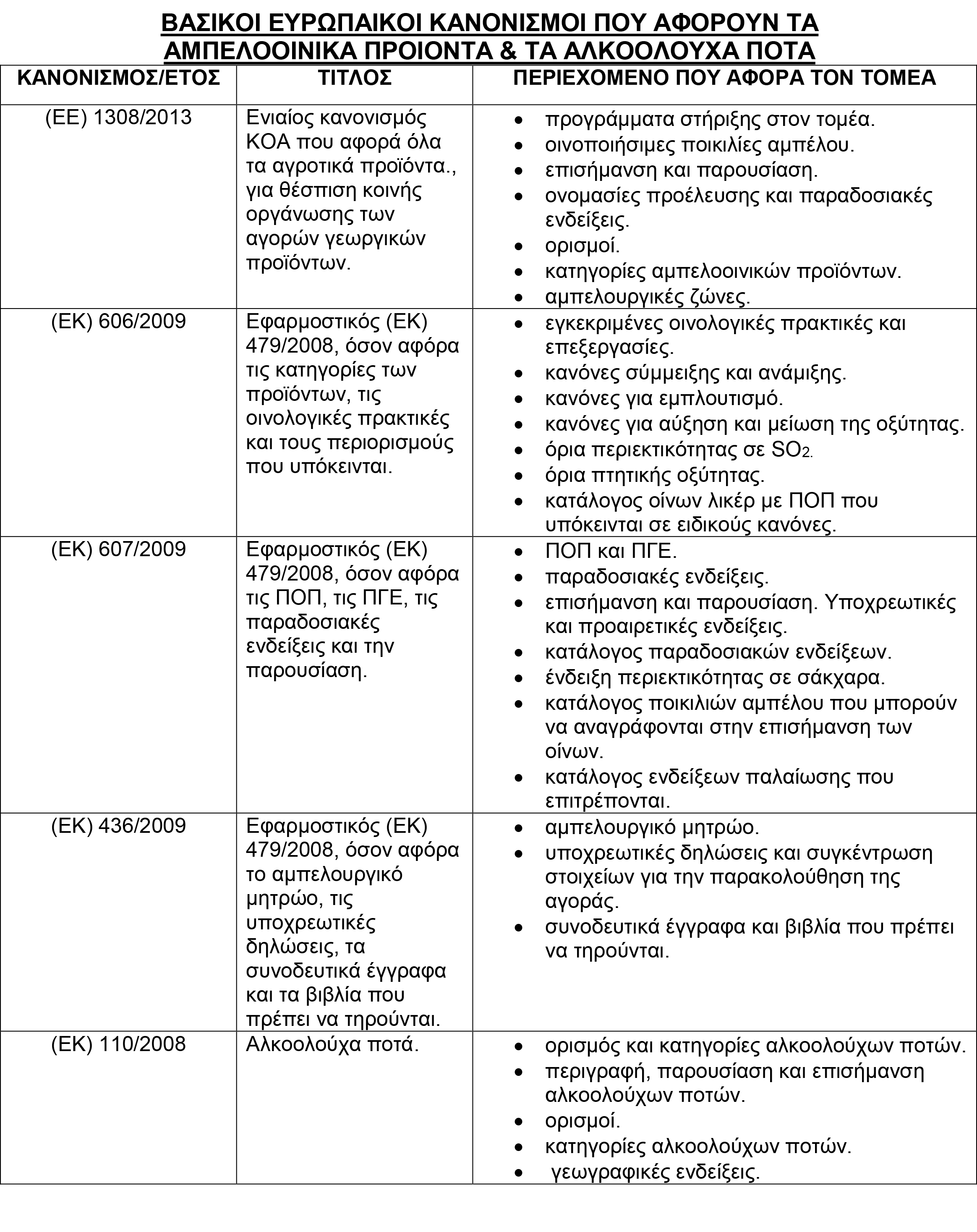 Με βάση τον πιο κάτω πίνακα, μπορείτε να βρείτε τους βασικούς κανονισμούς που αφορούν την ευρωπαική νομοθεσία που αφορά τα αμπελοοινικά προιοντα και τα αλκοολούχα ποτά.